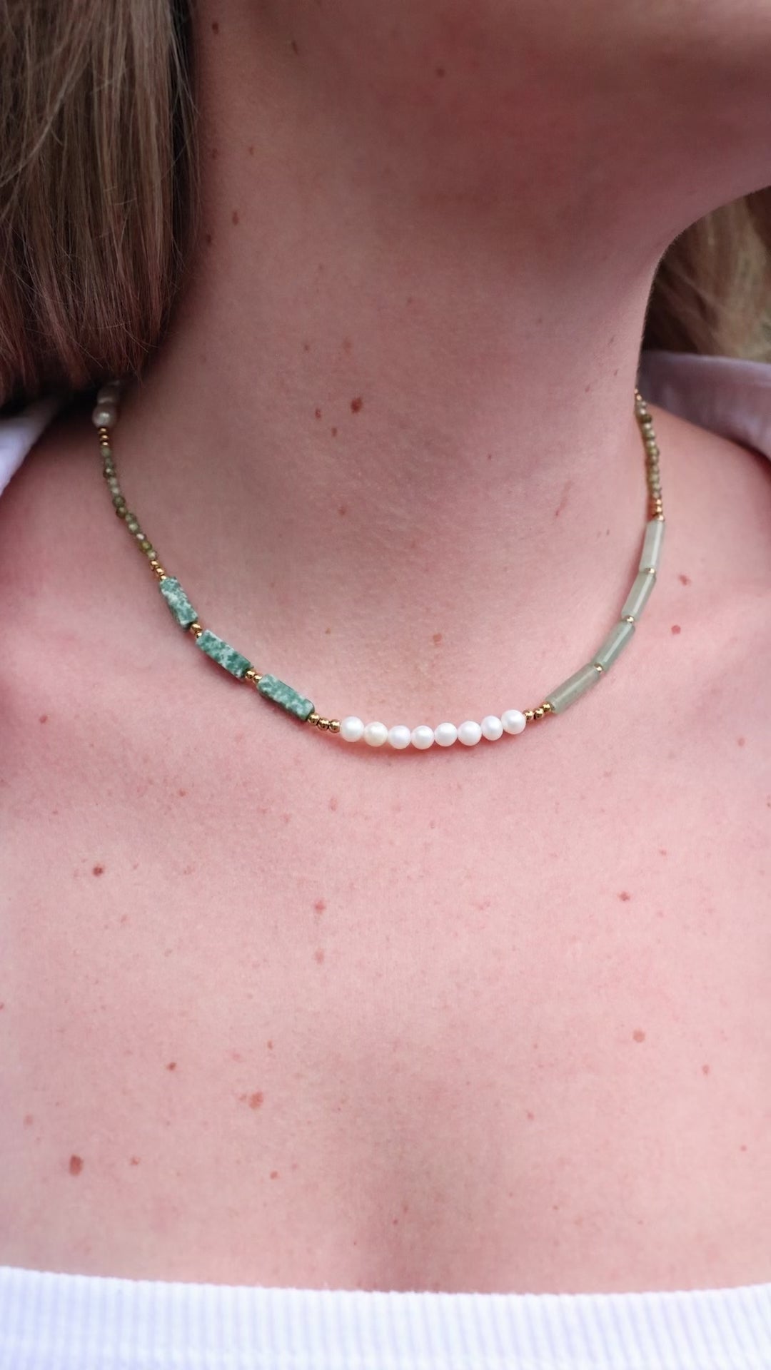 Колието Olivia съчетава вечна елегантност с нотка естественост. С участието на зелени естествени камъни, блестящи перли и златисти детайли, то съчетава различни материали в хармоничен, уникален дизайн.