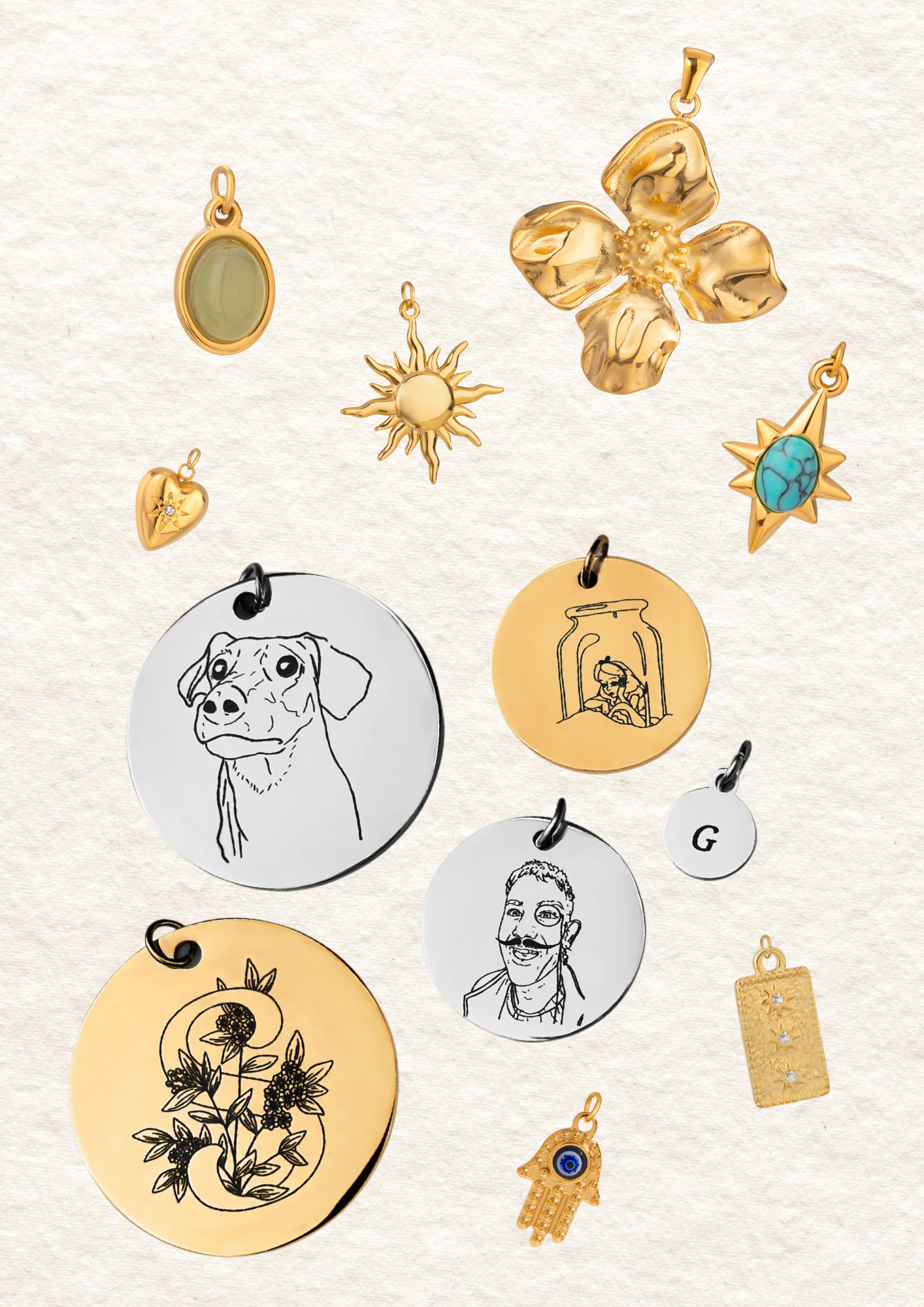 Jetzt wird dein Schmuckstück persönlich: Entscheide dich für klassische Gravuranhänger oder auffällige Statement Charms – wir bieten dir eine Auswahl aus über 200 einzigartigen Anhängern, mit Symbolkraft, Humor oder ganz viel Gefühl.