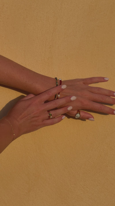 Das Baroque Sunset Armband ist die perfekte Ergänzung zur gleichnamigen Halskette und bringt sommerliche Leichtigkeit an dein Handgelenk. Rote, facettierte Glasperlen mit einem Durchmesser von etwa 3 mm bilden die Basis dieses Designs. Drei natürliche Süßwasserperlen und goldfarbene Akzente sorgen für ein stilvolles und harmonisches Gesamtbild.